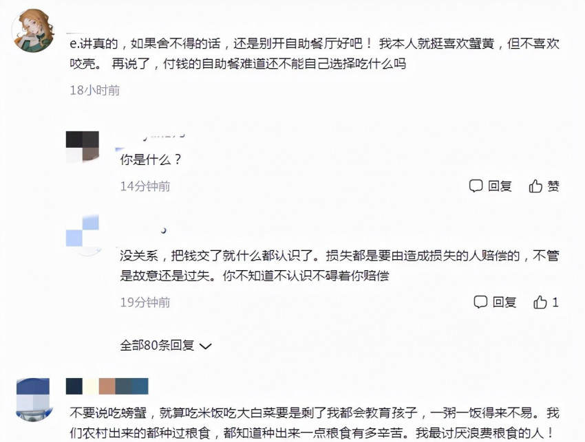 还有网友表示,店里的做法也不厚道,如果舍不得,就别开自助餐厅!我也是喜欢吃蟹黄,不喜欢咬壳。再说了,付钱的自助餐难道还不能自己选择吃什么吗?