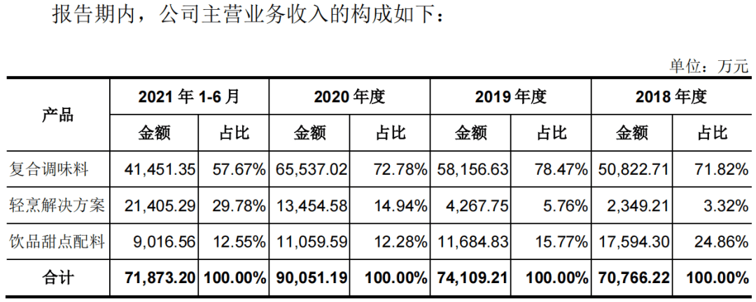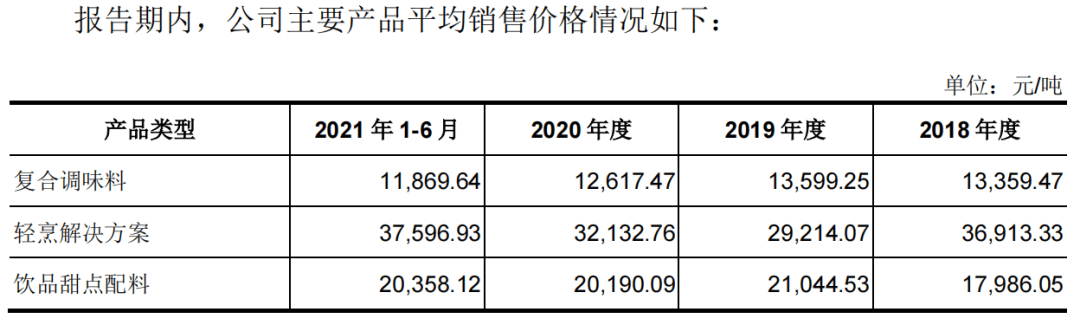 报告期内,为公司贡献大半营收的复合调味料产品,其平均销售价格由2019年的1.36万元/吨降至2021年上半年的1.19万元/吨。