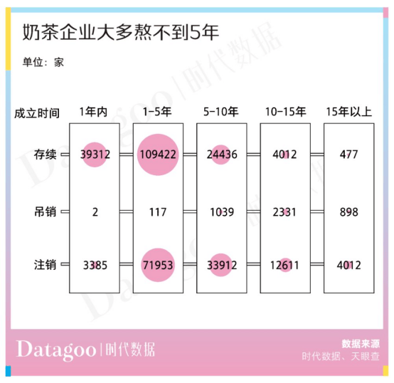 这意味着,接近40%的奶茶经营企业都无法熬到5年。