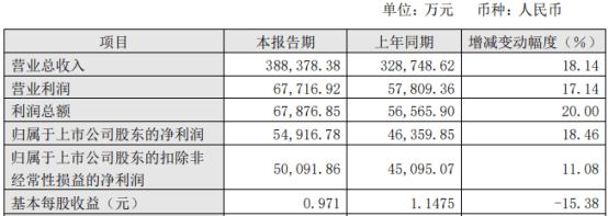 公告显示,广州酒家总资产为482,105.89万元,比本报告期初增长25.63%;基本每股收益为0.971元,上年同期为1.1475元。