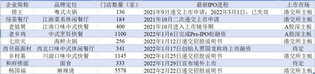 而第三波就是在2021年及以后,2021年下半年捞王、绿茶餐厅、老娘舅发布上市计划,次年乡村基、杨国福麻辣烫、和府捞面等品牌也加入了冲击上市的阵营。