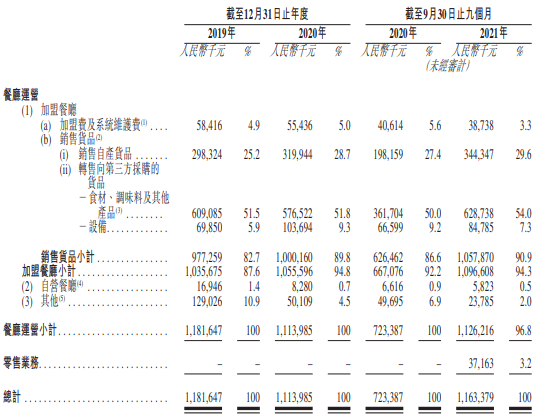 再进一步细分,杨国福麻辣烫营收结构分为餐厅运营和零售业务两大板块,其中餐厅运营为最主要收入来源,由加盟餐厅、自营餐厅等组成,通过向加盟餐厅收取“加盟费及系统服务费”和“销售货品”款项来获得收入。