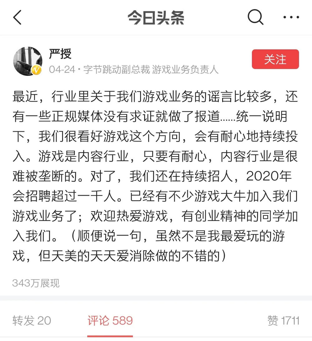 2020年4月,外界曾对字节跳动的游戏业务有着各种传闻。对此,严授在微头条上回应说,会持续投入游戏这一方向,并计划在这一年招聘千人以上。