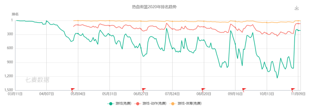根据七麦数据的统计,《热血街篮》自2020年3月上线以来,仅在AppStore游戏免费榜前100位待了一个月零四天,之后人气迅速滑落。