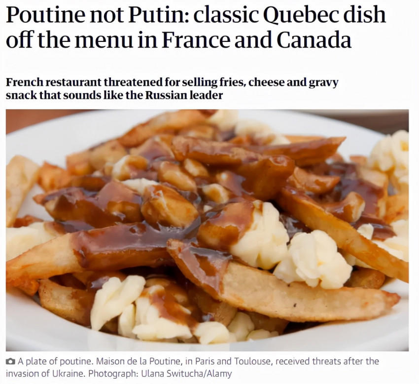 西方国家对俄罗斯领导人的愤怒,招致出现了一个不太可能的牺牲品:一种由薯条、奶酪凝乳和肉汁组成的法裔加拿大人美食。