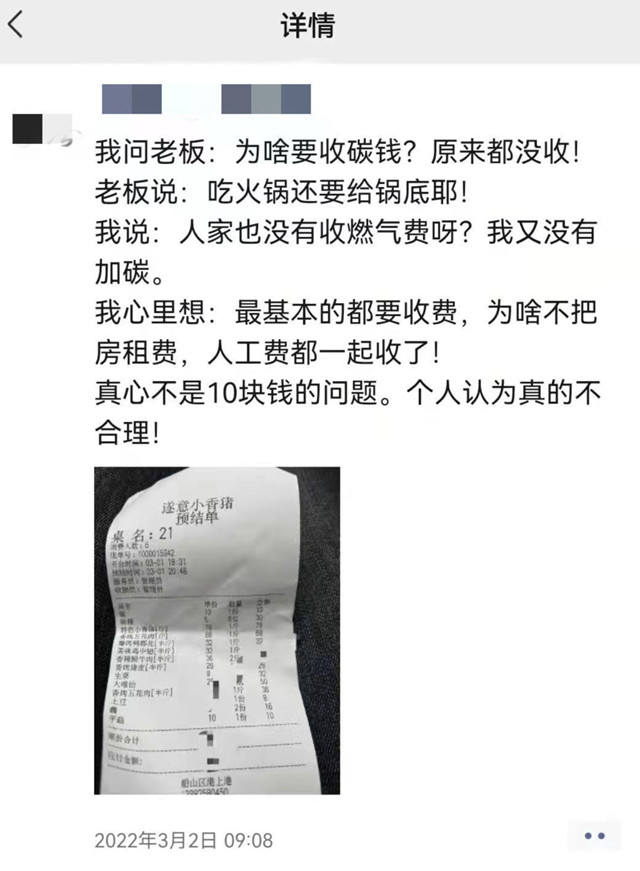 但该网友也承认,他相信在其他餐厅吃饭,虽然没有收燃气费、电费,但这些成本,店家是算在了餐费里的,“只是把碳费单列出来,有点扎眼。”