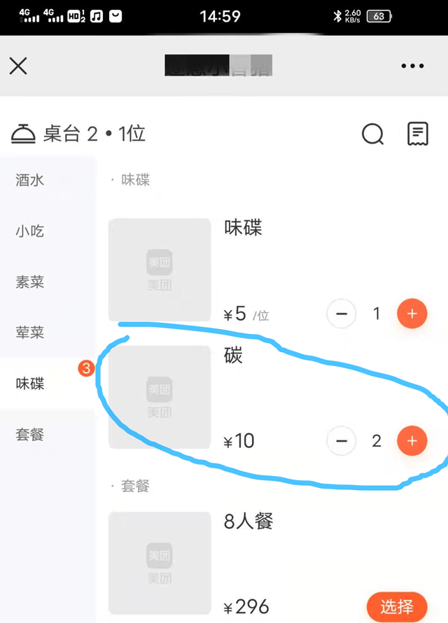 ↑扫码点餐后的菜单显示碳费10元一位