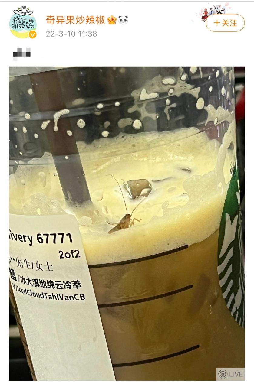 近日,网友“奇异果炒辣椒”发文称,自己在星巴克的一款饮品中喝出了一只蟑螂。