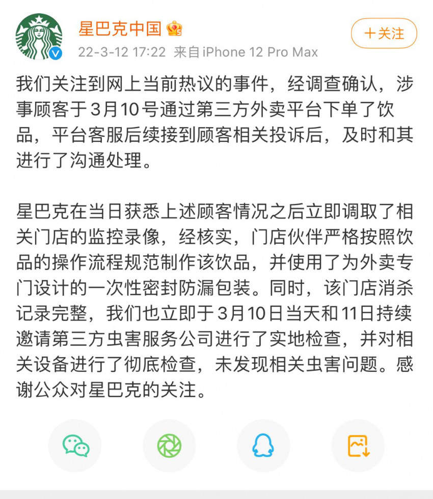 星巴克在当日获悉上述顾客情况之后立即调取了相关门店的监控录像,经核实,门店伙伴严格按照饮品的操作流程规范制作该饮品,并使用了为外卖专门设计的一次性密封防漏包装。同时,该门店消杀记录完整,我们也立即于3月10日当天和11日持续邀请第三方虫害服务公司进行了实地检查,并对相关设备进行了彻底检查,未发现相关虫害问题。