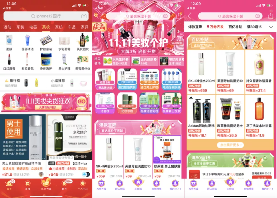 往年双11服装是第一类目,今年美妆类产品取而代之成为大头。天猫官方数据显示,在今年双11开场首个小时的十大爆款中,美妆类品牌占了七个,资生堂、芙丽芳丝等品牌单品一开场就断货,雅诗兰黛成为今年天猫双11首个破10亿的品牌。后起之秀拼多多今年同样将重点放在美妆上,旗下标杆营销IP“百亿补贴”上线大牌美妆专区,SK-II神仙水、海蓝之谜经典传奇面霜、雅诗兰黛小棕瓶等大牌单品均刷新全网最低价。美妆,已成为今年双11电商平台的最核心战场。