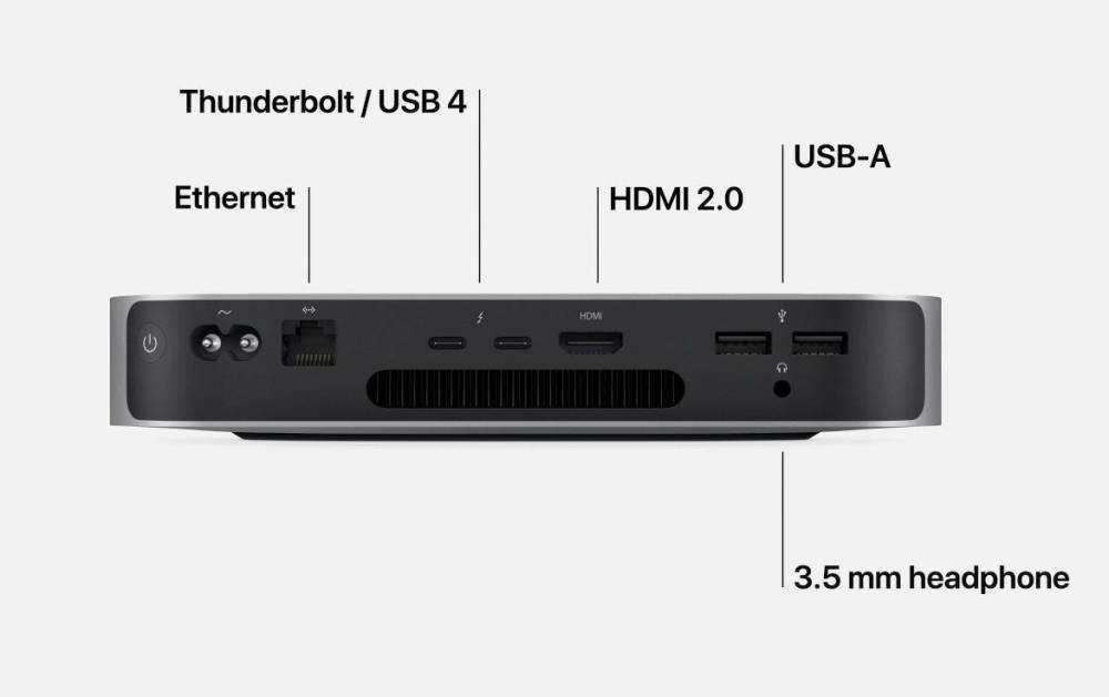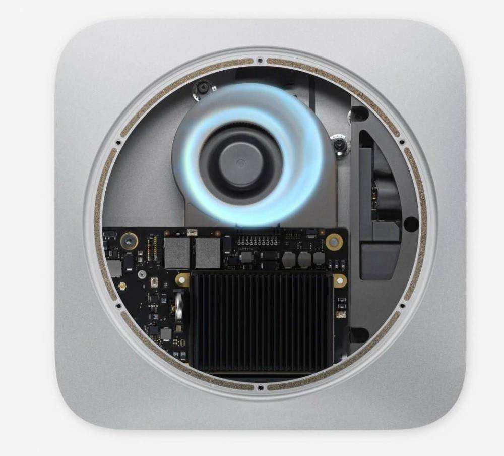 另外新款Mac mini内部结构也有所调整,采用单风扇设计,在芯片上方有一个散热片,进一步释放了M1芯片的性能,机身拥有一个雷电接口、一个HDMI2.0接口以及两个USB-A接口和网线、3.5mm耳机接口。