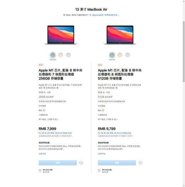 首先发布的MacBook Air提供两个版本可选,均搭载Apple M1芯片和八核心处理器,但GPU分为7核与8核两个版本,对应的存储容量分别为256与512GB,售价分别为7999与9799元,不支持选配。