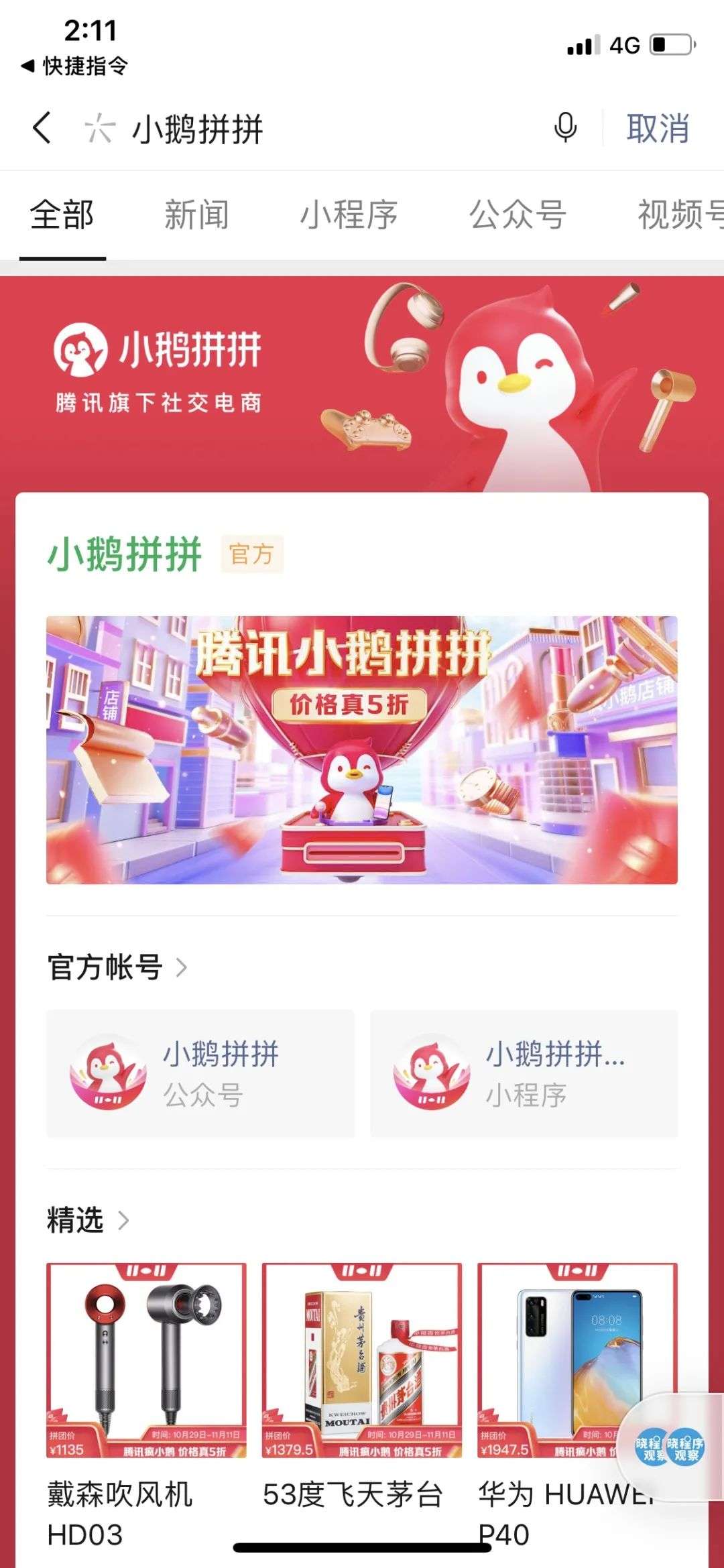 在双十一前,「小鹅拼拼」便在搜一搜里上线了品牌官方区,集合了小鹅拼拼品牌页、公众号、小程序和精选商品页,用户在搜索小鹅拼拼时,可以直接点击商品直达购买页面。