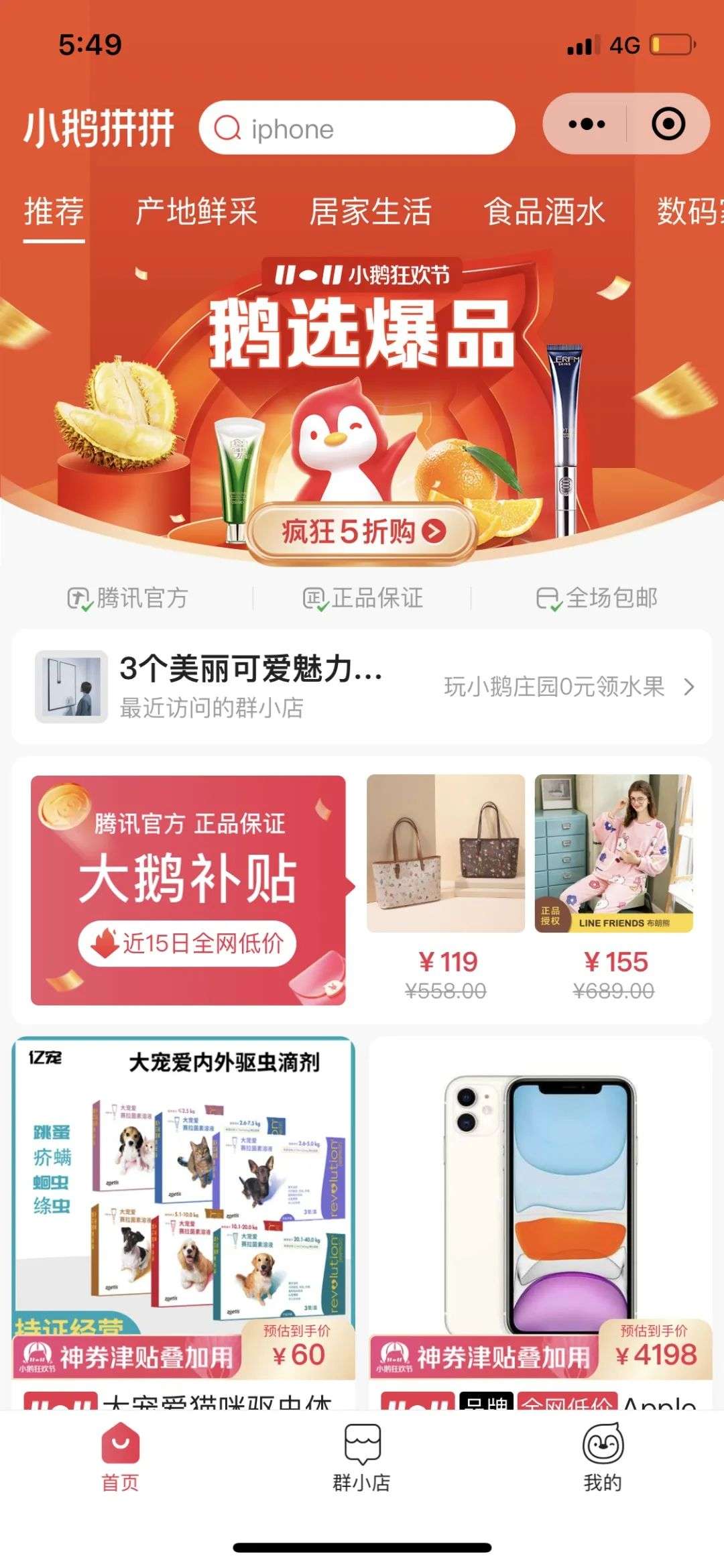今年6月,小鹅拼拼新增“群小店”一级入口,只要将小程序分享到群里,就可以开一个家属于个人的“群小店”,且只要是群成员,都可以在群里开通群小店功能带货。如此一来,对于即便没有小程序的小微商家来说,也能够在群内实现从“群-小程序”的直接转化。