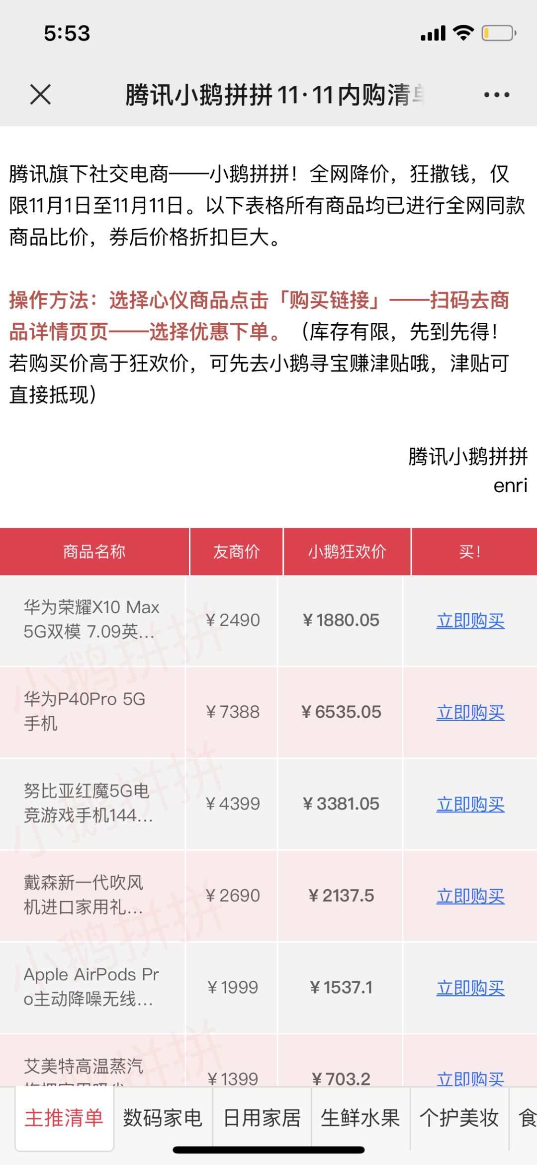 同时,「小鹅拼拼」为每个热销商品都附带了商品链接,用户想要下单时,一键即可购买。用大差价作为驱动力,促使用户购买,并尽可能的减少用户的购买链路,同时表格的便利性也能让用户不必再四处比价,直接分享给朋友。