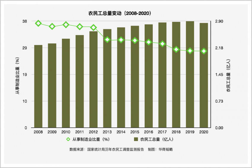这里面,自然有用工荒的原因。据国家统计局数据,2008年,进入制造业的农民工比重达37.2%,2020年则下滑到27.3%。