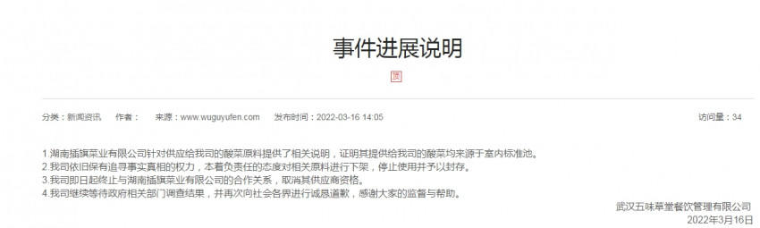 16日上午,五谷渔粉声明称,湖南插旗菜业有限公司确是其酸菜原料供应商之一,已第一时间约谈插旗菜业负责人,并对相关酸菜原料进行下架,全面停止使用并封存,等待相关部门的进一步检查。