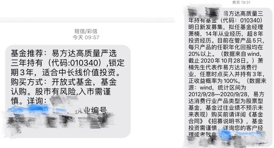 多家大型银行的渠道人士向每经记者证实,易方达高质量严选基金是近期推的重点。而持续的短信、微信等推介形式,也确实达到了非常好的发行效果。给大家展示一下记者在今天收到的其中两则推介短信,还有一些渠道人士表示“昨天就开始推广了”。