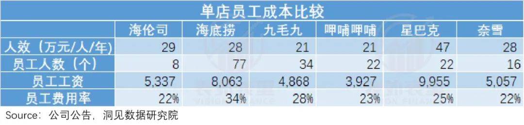 以支出大头之一人员成本来说,正常状态下,海底捞因服务人员需求大、门店面积大等原因,平均单店员工数达77人,高于行业水平很多。只是人效也很高,总体平衡。