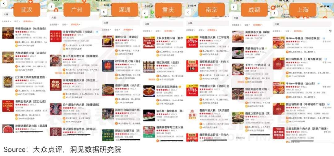 如下图,随机抽取一二线城市的火锅类好评榜单前十名,均不见海底捞。上榜的都是单品类或者主题火锅等网红品类。