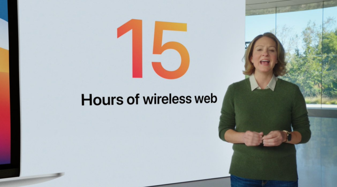不过最令人兴奋的可能还是在续航方面的提升,搭载 M1 芯片的 MacBook Air 在网页浏览方面可以达到 15 小时续航,播放视频可以达到 18 小时,整体续航最多提升 6 小时以上,是有史以来续航最好的 MacBook Air。