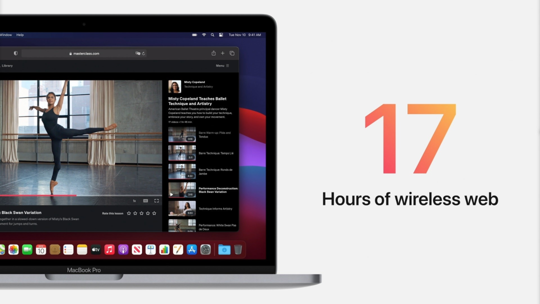 主打性能 MacBook Pro 自然是带有风扇设计,但是续航提升依旧恐怖,17 小时网页浏览续航,20 小时视频播放续航,整体最多提升 10 小时,苹果直接给出「有史以来续航最好的 Mac」的评价。