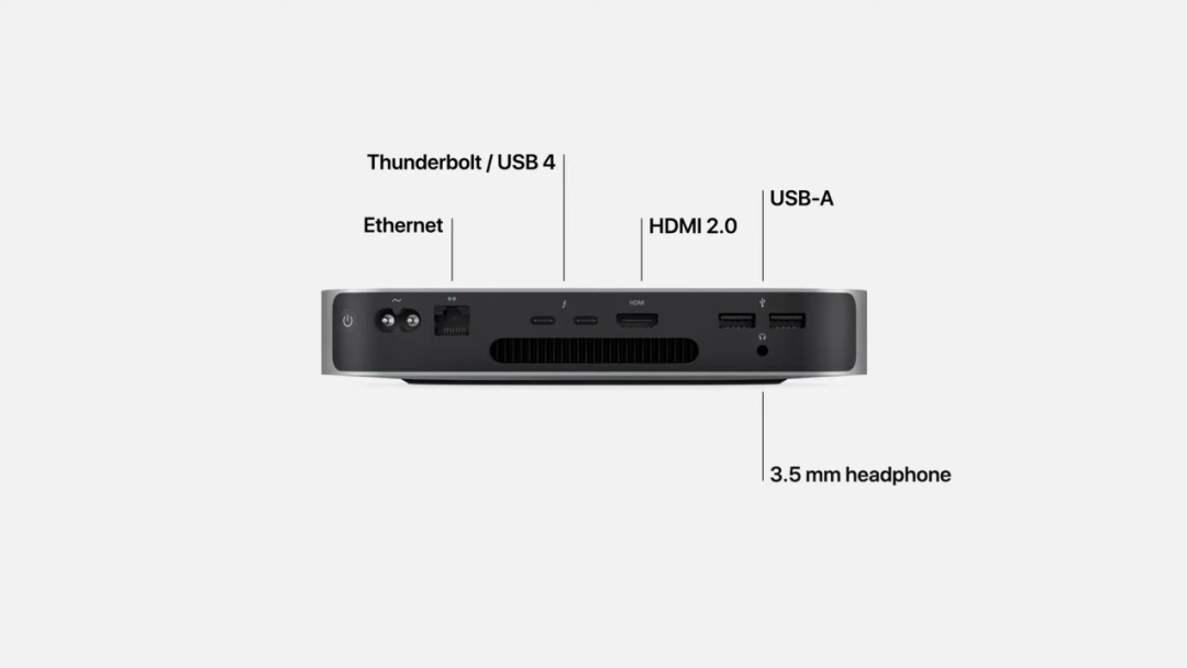 值得一提的是,新款 Mac mini 相比于 2018 款在接口上有比较大的区别,在依然保留 HDMI 2.0 的基础上,由原来的 4 个雷雳 3 接口变成了 2 个雷雳 4 接口。