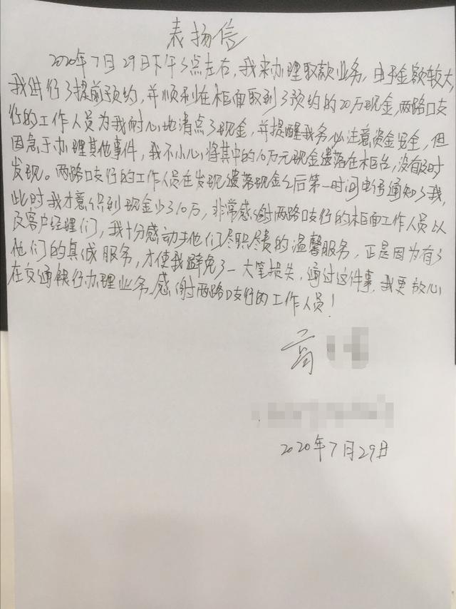 该网点客户服务经理立即发现了遗落的现金,但此时高女士也不知去处,于是工作人员将此事上报给营运主管,通过客户预留电话联系上了高女士,高女士此时还并不知道自己的资金遗失,面对“失而复得”的财产,高女士对交行重庆两路口支行的员工赞不绝口,她认认真真写下感谢信后,还坚持要赠与工作人员解暑的清凉饮料表示感谢,但该行工作人员表示,保护好客户的资金安全是他们应该做的。