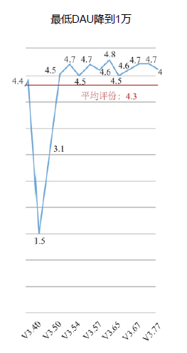 转型社区的快手面临了它的第一次生死危机,初次转型的3.4版本迎来了数据和用户口碑的同时滑铁卢。版本评分从4.3分一落千丈仅剩1.5分,而DAU最低时降到了只剩1万。