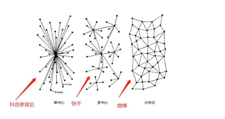 与实际意义上的,通过网状的社交关系链,用户发布内容,以用户关系链为传播路径的“去中心化”内容分享有着根本的区别。