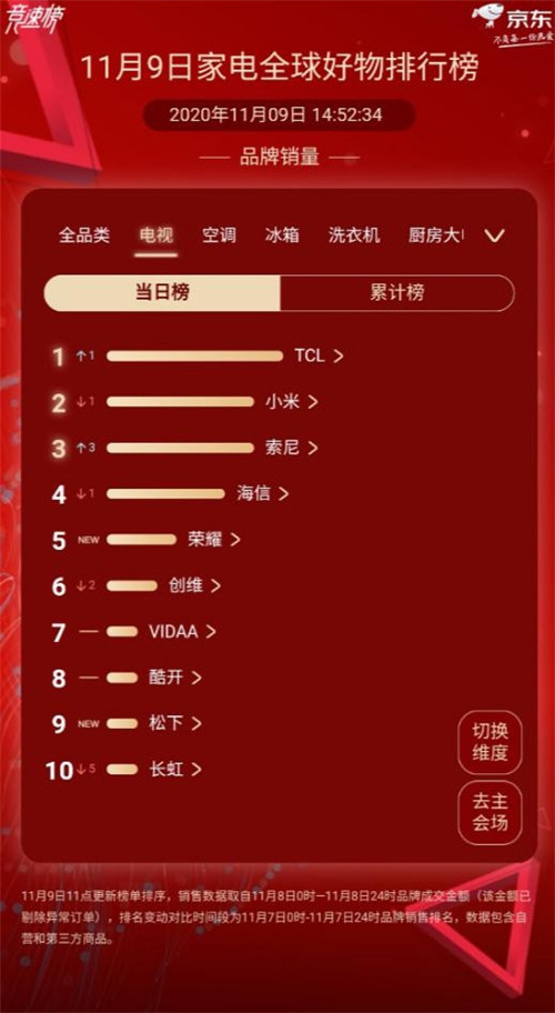 这种新颖独特的直播形式,除了让观众直呼过瘾之外,更是打下卓越战绩,当天直播间观看量达366万,其品牌销量在京东发布的11月9日家电全球好物排行榜-全品类当日榜单中名列前三。惊喜不止于此,在电视品类当日榜单中,TCL更是占据了冠军的宝座。