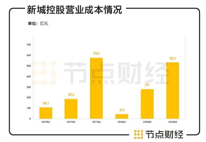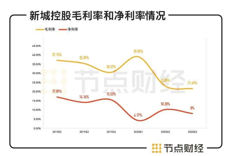 2020年前三季度,新城控股的营收虽然显著增长,但由于南京、苏州、合肥等城市高价项目的结转,其营收成本也大增,这导致期间其综合毛利率下降13个百分点至21.65%,综合净利率下降了6个百分点至8%。