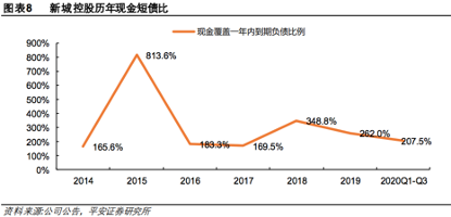 2020年8月20日,住建部、央行召开的重点房地产企业座谈会传递出控负债、稳房价的两大重要信号,确认了房企融资的“三道红线”:剔除预收款后的资产负债率不得大于70%,净负债率不得大于100%及“现金短债比”小于1。可见,在监管的这几个方面,新城控股基本维持了不错的水平。