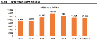 可见,不论是合同销售面积还是销售金额,新城控股2020年前三季度的同比增长水平均是2016年以来的最低点。同时,其销售均价同比下降8.7%至 10811.1 元/平方米,几乎回到了2015年到2016年之间的水平。不过,在整体行业放缓的情况下,新城控股的销售面积、金额依然分列全国第 7位和13 位。
