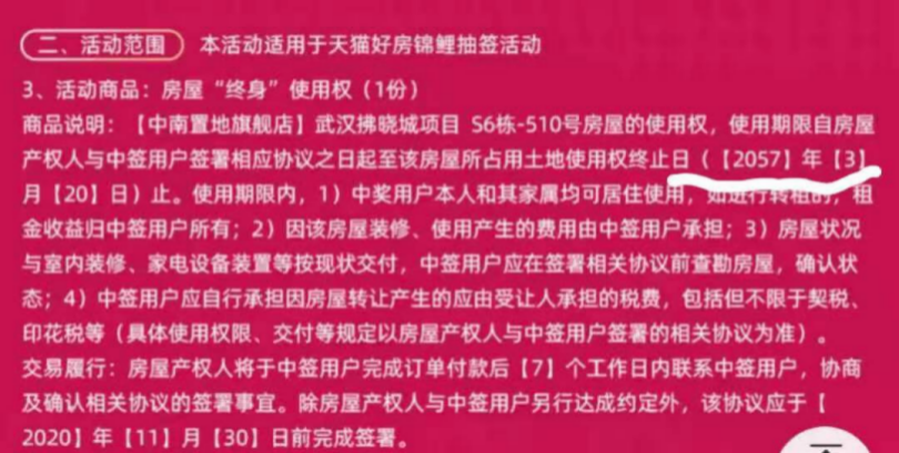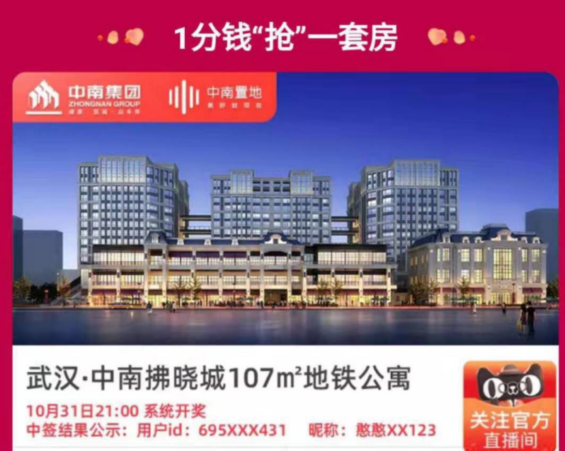 不过如果单纯想薅羊毛,天猫好房还有个天赐好房活动,10月31日已经有人以1分钱抢到了一套武汉公寓的终身使用权,虽然年限是36年。