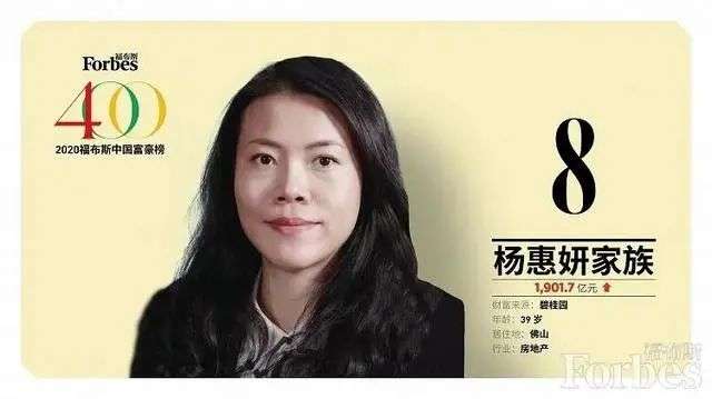 作为碧桂园创始人杨国强的继承人,杨惠妍是福布斯中国富豪排行榜前10中唯一的女性。同2019年相比,杨惠妍家族的财富增加了211.8亿元,排名从第5名下滑至第8名。