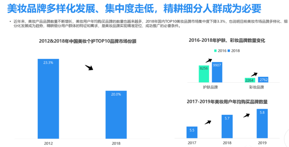 TalkingData今年10月发布的《美妆行业细分用户洞察报告》显示,今年的美妆品牌多样化发展、集中度走低;高端美妆人群消费活跃,追求全流程护肤,崇尚精致妆容,并且注重产品口碑。