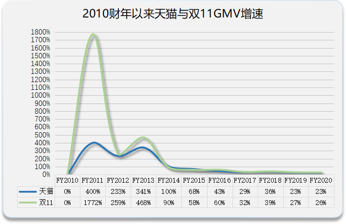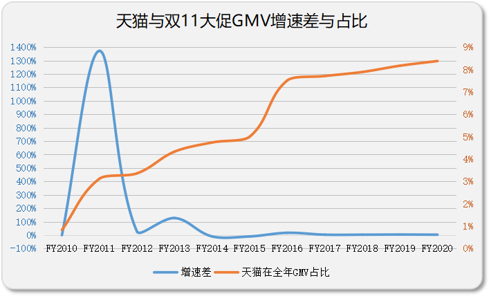 增速下滑的同时,天猫在全年GMV的占比却越来越高,第一个双11占天猫不到1%,到2020财年,占比已接近8.4%。