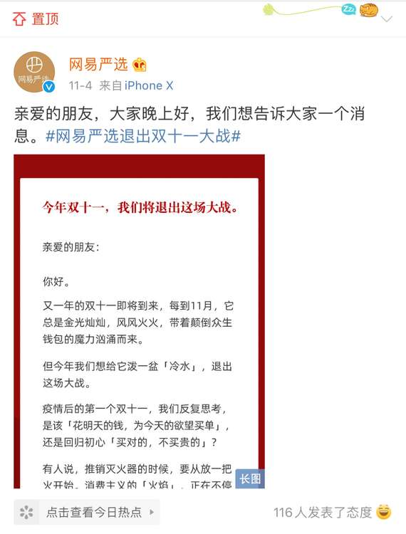 11月4日晚间,网易严选发布了一封题为“今年‘双11‘,我们将退出这场大戏的公开信“,内容很长,大致有两个意思。上半篇是檄文,痛陈多年双十一促销套路,像是两军交战前先要骂阵;下半篇是广告,表白自己没有套路只有实打实的补贴,颇有顾影自怜的既视感。
