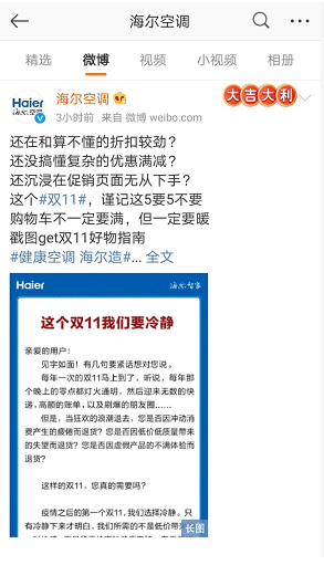 就在这时,海尔空调及时给用户提了个醒。11月9日,海尔空调在官方微博向用户发出“这个双11我们要冷静”的呼吁:我们所需的不是低价带来的一时快感,而是货真价实的健康守护。