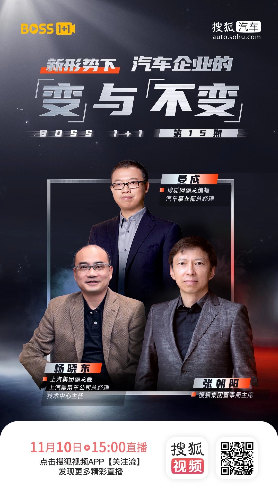 搜狐视频今日上线直播品牌节目《BOSS1+1》第十五期,用视频直播深度对谈企业领袖,通过行业领袖间的深度探讨揭示社会经济产业新动向。本期话题为“新形势下,汽车企业的变与不变”,由搜狐公司董事局主席兼CEO张朝阳“同框”上汽集团副总裁、上汽乘用车公司总经理、技术中心主任杨晓东,同时由搜狐网副总编辑、汽车事业部总经理晏成连线主持。