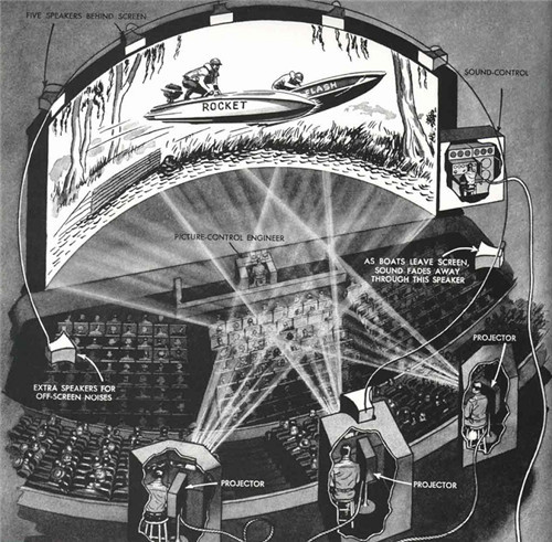 《阿拉伯的劳伦斯》是诞生于上世纪50年代的“IMAX”电影,是宽银幕立体电影的典范。所谓宽银幕立体电影,是用三个投影仪同时并排映射出三幅画面,再将它们结合,投射到一个巨大的银幕上。大银幕被设计为曲面屏,为的是覆盖住观众的整个视野,提供给观众一份身临其境的沉浸式体验——你不只是在看电影,而是和电影融为一体。