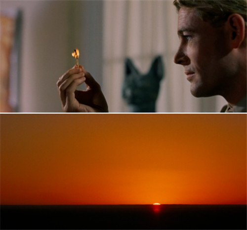 这份沉浸式体验,也能放大人们对于影像背后的逻辑与情绪的感知,由景入境,让人能够体会到画面背后所蕴含的内义。当英国人男主角受命出发去撒哈拉沙漠带领阿拉伯人攻城夺地时,他在英军营帐里自信满满地吹熄了一根火柴,可下一个镜头,一轮炎炎红日缓慢从撒哈拉沙漠边升起——吹不灭红日,他必将遭受磨难。