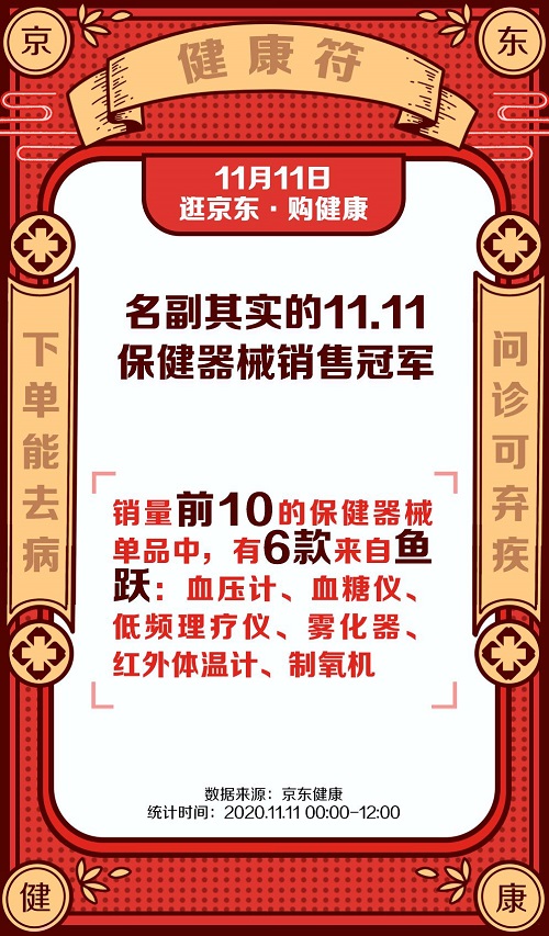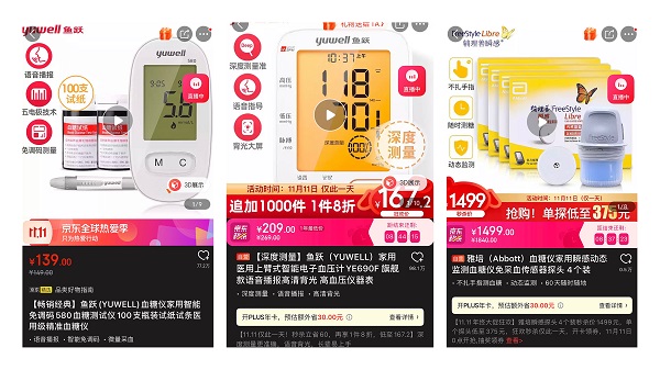 与此同时,针对家庭场景的智能检测设备销售额也有了显著增长。11月11日前30分钟之内,京东健康血糖仪成交额同比增长20倍,半日成交额是去年同期的600%,事实上,在京东健康11.11保健器械单品销售额“TOP10排行榜”中,鱼跃、雅培、欧姆龙等品牌的血糖仪、血压计占据了半壁江山,慢病防控意识提升可见一斑。