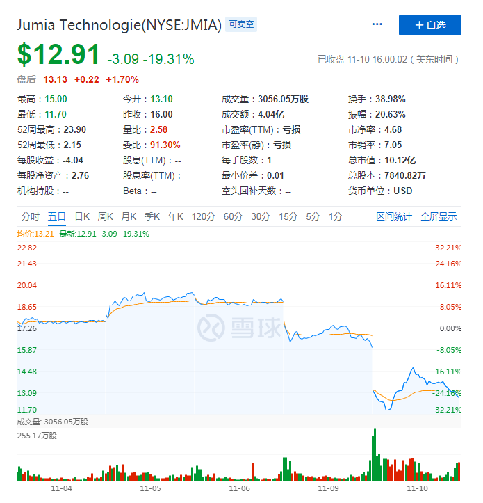 财报数据显示,营收同比再度下滑,平台三大KPI订单量、年度活跃消费者、GMV较上一季度均有不同程度的下降,其中GMV(总成交金额)同比下降28%。财报发布后,10日盘前Jumia股价暴跌超19%,盘后受辉瑞疫苗消息影响股价回升1.7%。截至美股研究社发稿,Jumia每股报12.91美元,总市值为10.12亿美元。