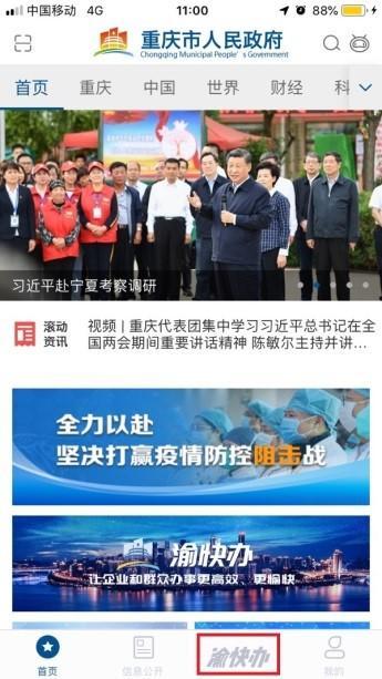 1.打开“重庆市政府”APP,点击下方“渝快办”