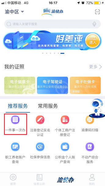 2.“渝快办”首页推荐服务中点击“一件事一次办”