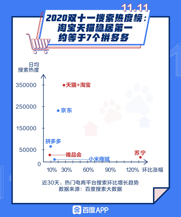 数据显示,近30天,热门电商平台搜索热度涨幅排行榜中,苏宁环比增长130%以上,涨幅位列第一,成为今年双十一前搜索热度增长最明显的电商平台。