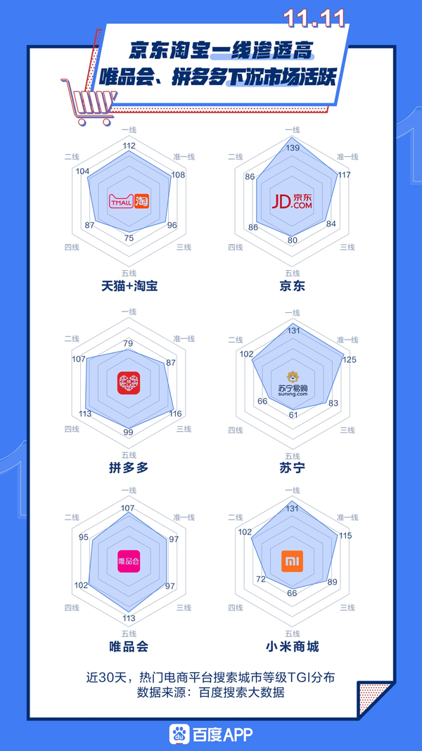 曾经的电商老三唯品会,今年却尝试跟拼多多在下沉市场你追我赶。百度搜索大数据显示,近30天,热门电商平台搜索兴趣城市等级分布中,唯品会五线城市网民搜索兴趣高,而在关注京东的用户中,一线城市网民搜索兴趣走高。