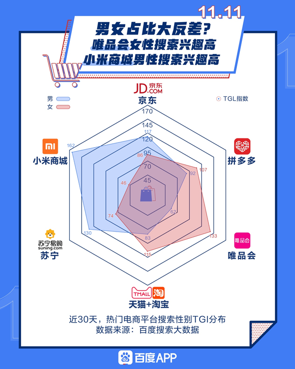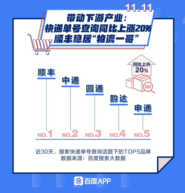 除此之外,搜索大数据还指出,尽管各大电商平台“去性别化消费”趋势明显,但小米商城和唯品会的搜索人群中性别仍然存在较大性别差异。与此同时,双十一消费的增长使快递物流等下游产业链也将迎来考验,近30天,“快递单号查询”相关内容搜索热度同比上涨20%,顺丰、中通、圆通成为热搜前三的品牌。
